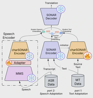 Current translation systems, despite being highly multilingual, cover only 5% of the world’s languages. Expanding language coverage to the long-tail of low-resource languages requires data-efficient methods that rely on cross-lingual and cross-modal knowledge transfer. To this end, we propose a character-based approach to improve adaptability to new languages and modalities. Our method leverages SONAR, a multilingual fixed-size embedding space with different modules for encoding and decoding. We use a teacher-student approach with parallel translation data to obtain a character-level encoder. Then, using ASR data, we train a lightweight adapter to connect a massively multilingual CTC ASR model (MMS), to the character-level encoder, potentially enabling speech translation from 1,000+ languages. Experimental results in text translation for 75 languages on FLORES+ demonstrate that our character-based approach can achieve better language transfer than traditional subword-based models, especially outperforming them in low-resource settings, and demonstrating better zero-shot generalizability to unseen languages. Our speech adaptation, maximizing knowledge transfer from the text modality, achieves state-of-the-art results in speech-to-text translation on the FLEURS benchmark on 33 languages, surpassing previous supervised and cascade models, albeit being a zero-shot model with minimal supervision from ASR data.